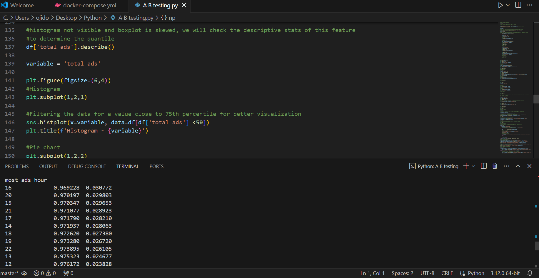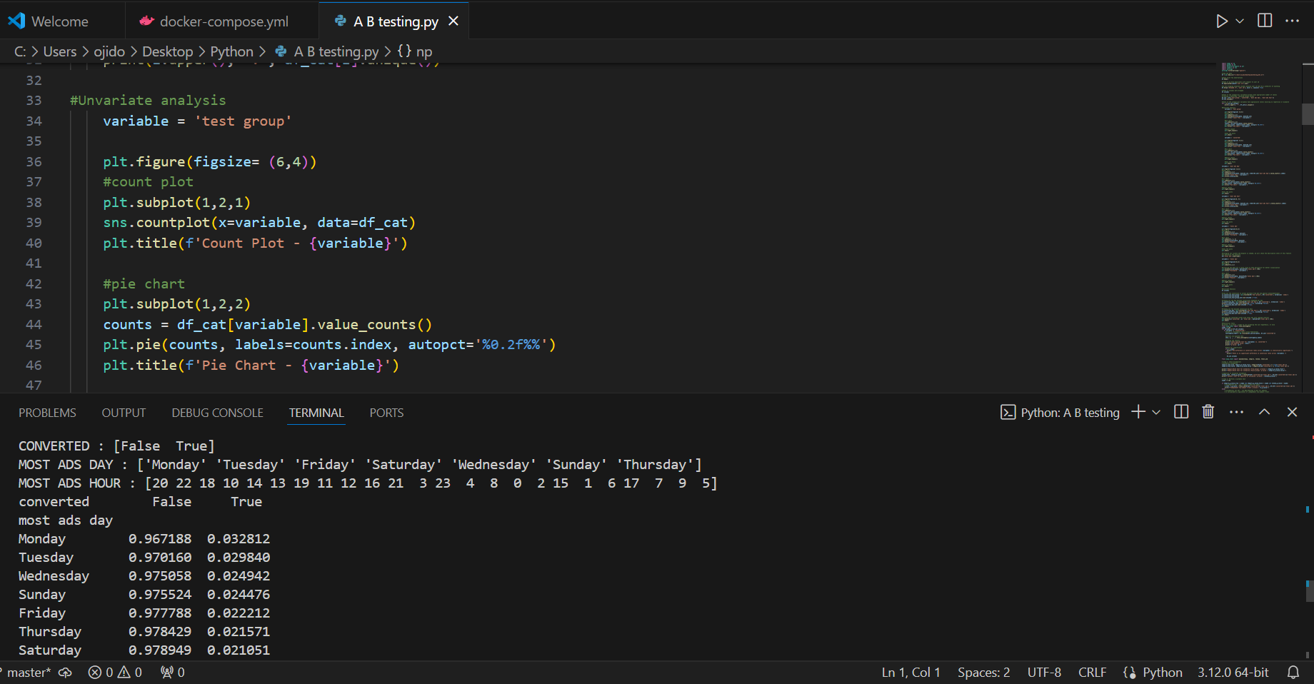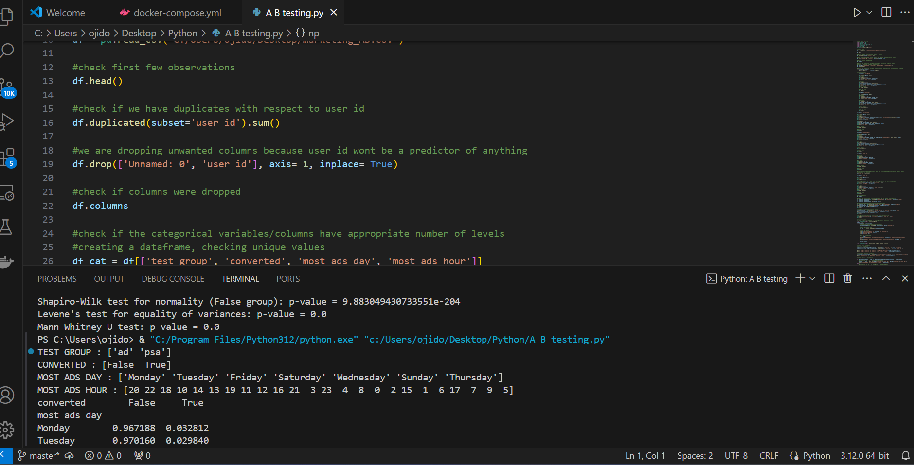 A/B testing marketing ads on Kaggle data in VS Code: Scripting in Python with scipy, matplotlib, requests, warnings, pandas, seaborn, beautiful soup, Numpy, and more variations with screenshots for clarity.