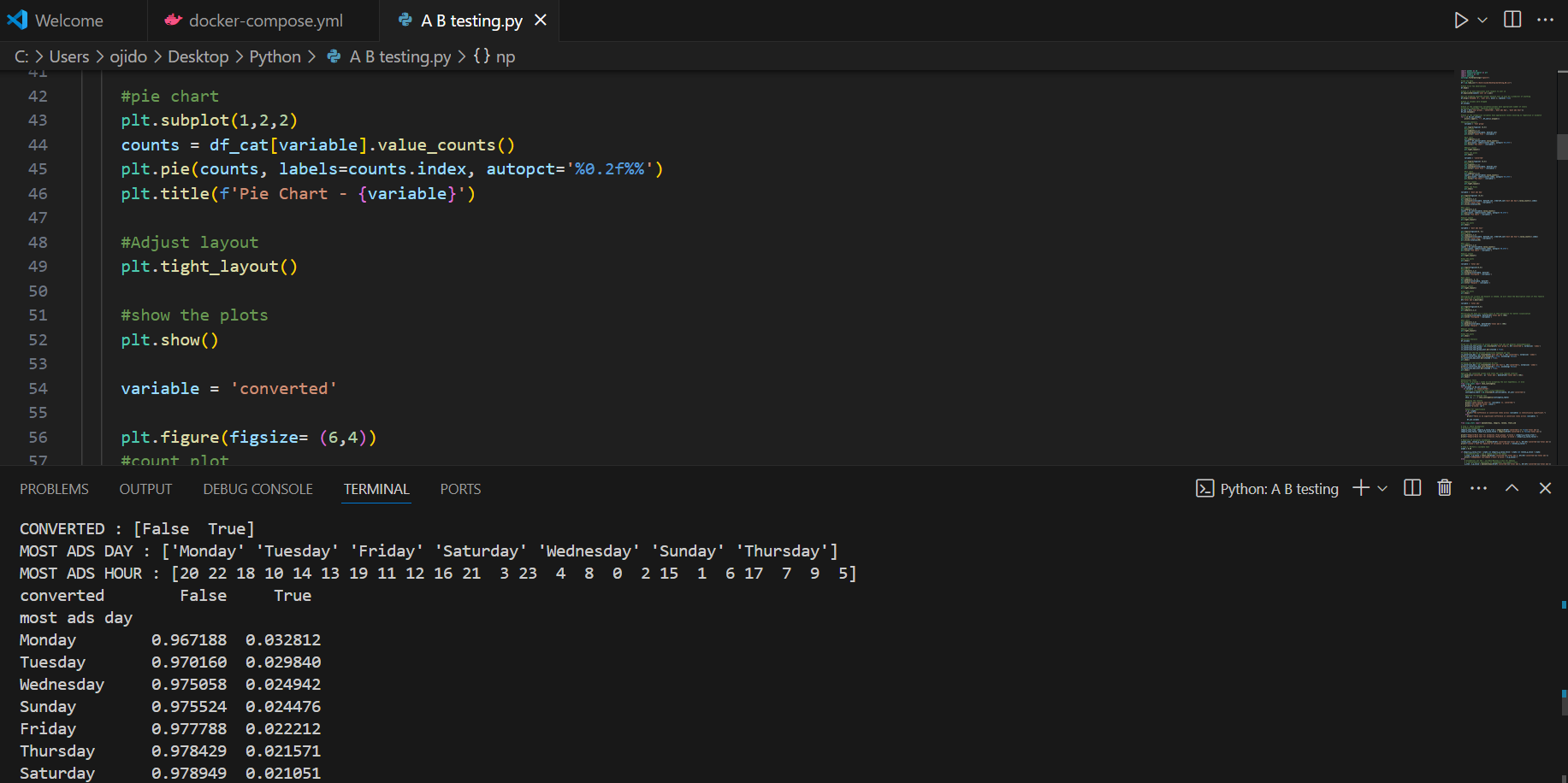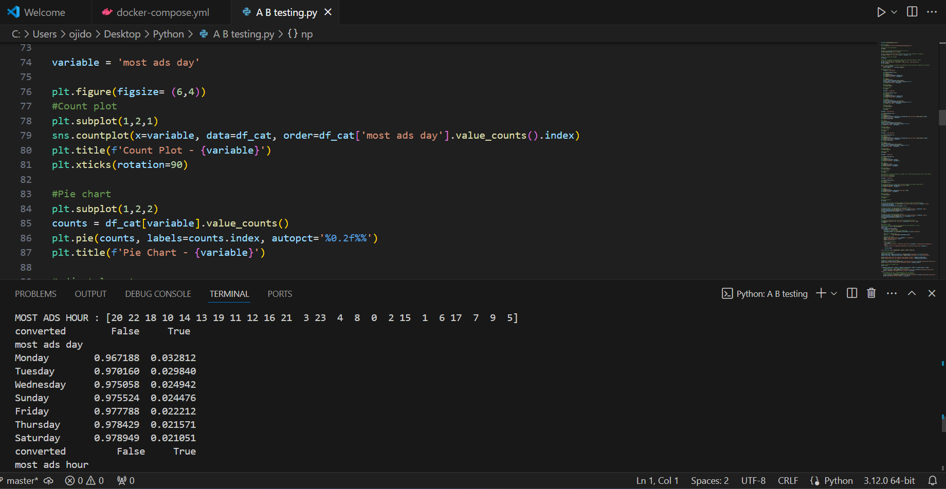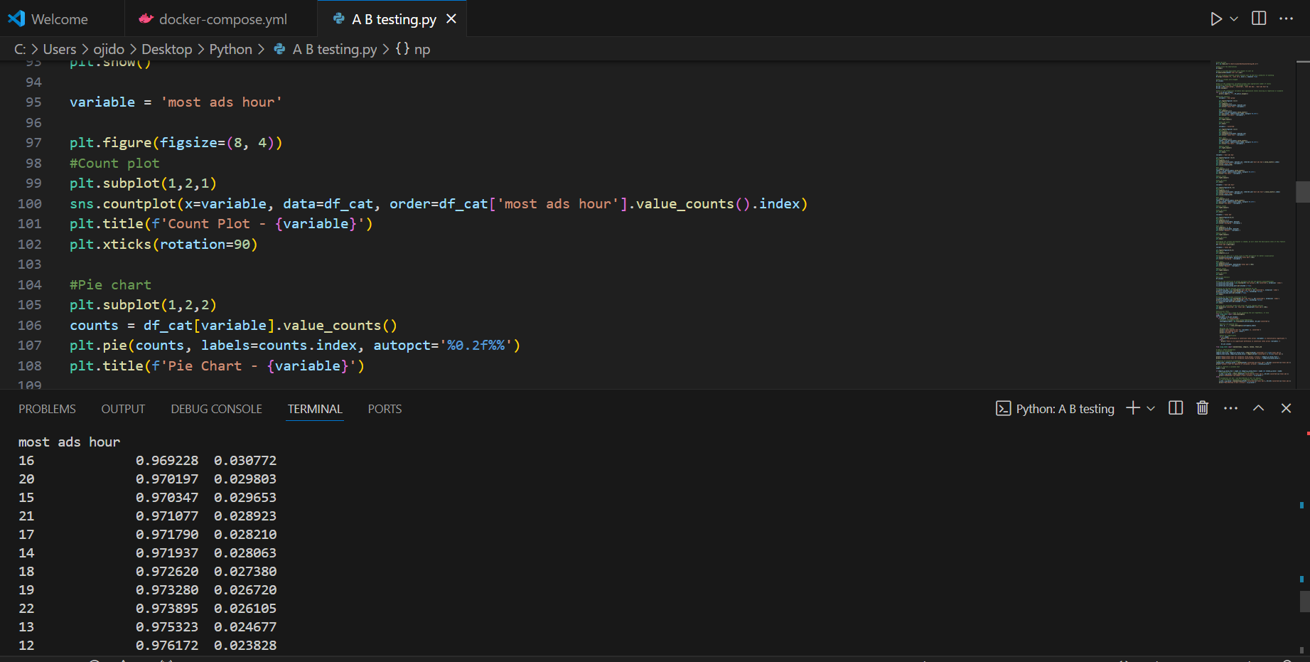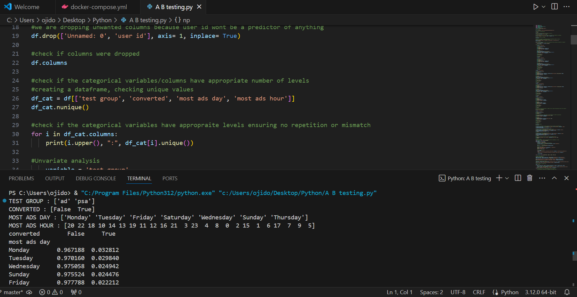 A/B testing marketing ads on Kaggle data in VS Code: Scripting in Python with scipy, matplotlib, requests, warnings, pandas, seaborn, beautiful soup, Numpy, and more variations with screenshots for clarity.